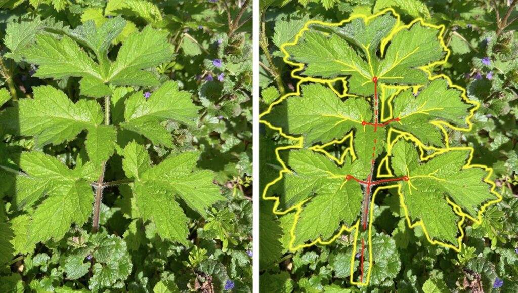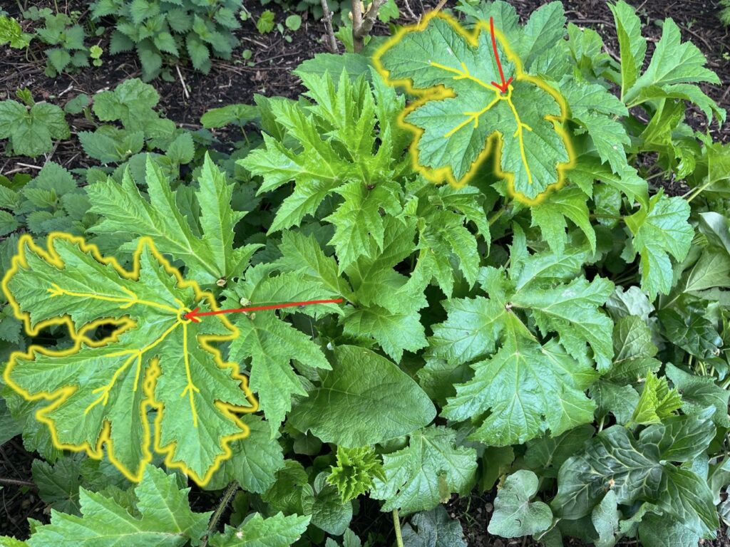 Hierboven de al wat grotere Reuzenberenklauw, diep ingesneden blad , drie hoofdnerven (gele lijn) zodat het uit drie delen lijkt te bestaan. Rode pijl wijst naar de plek waar het blad aan de steel vastzit.
