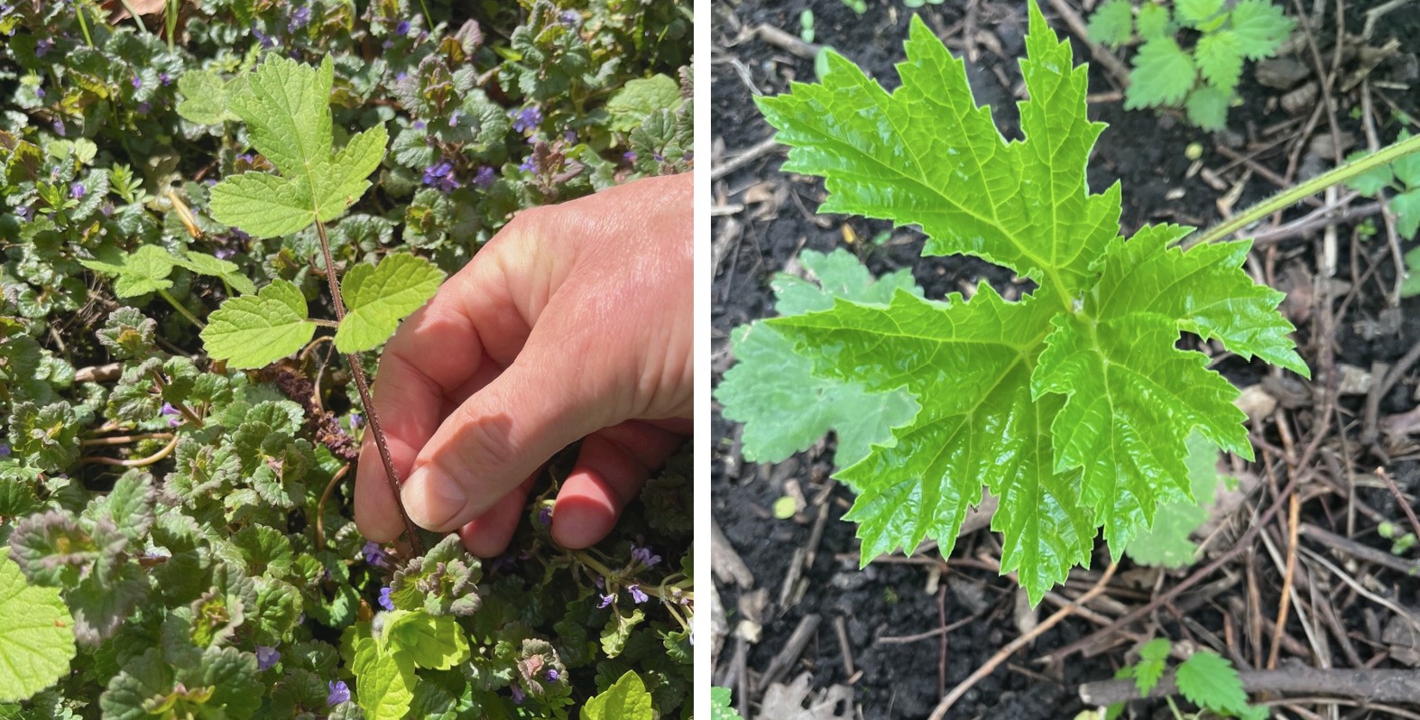 Rechts is de Reuzenberenklauw te zien, groene steel met roodbruine vlekken, één groot blad, sterk ingesneden en sterk getand, de kleur is helderder groen dan de gewone Berenklauw.